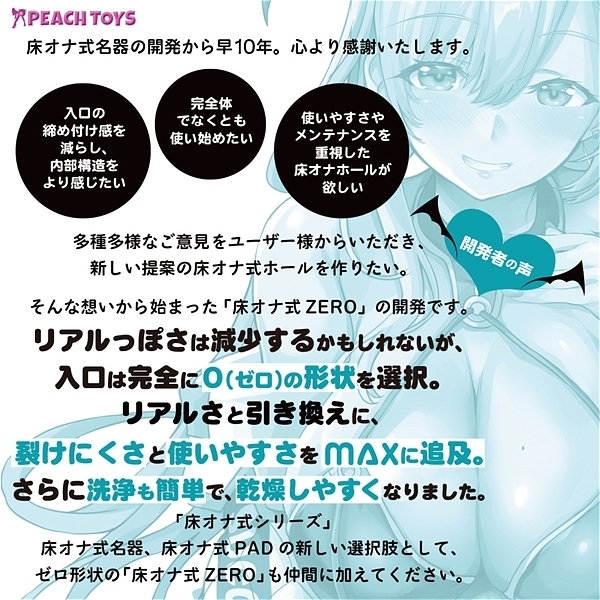 床オナ式シリーズ!10周年!「床オナ式ZEROサキュバスGAL」が新登場!「床オナ式ZERO(ゼロ)」とは…入り口がゼロ形状!入れにくいイライラゼロ!使用中入り口のコリコリした締め付け感ゼロ!材は、<STD(スタンダード>と<HARD(ハード)>の同時発売!!<ハード>版は、体重90kgの男性が体重を掛けて乗っても大丈夫な高弾力素材を採用!HARDな使用感!魔性の清純スケベ系ハードサキュバス!どんな状態でもHARDに吸い取っちゃうわよ。