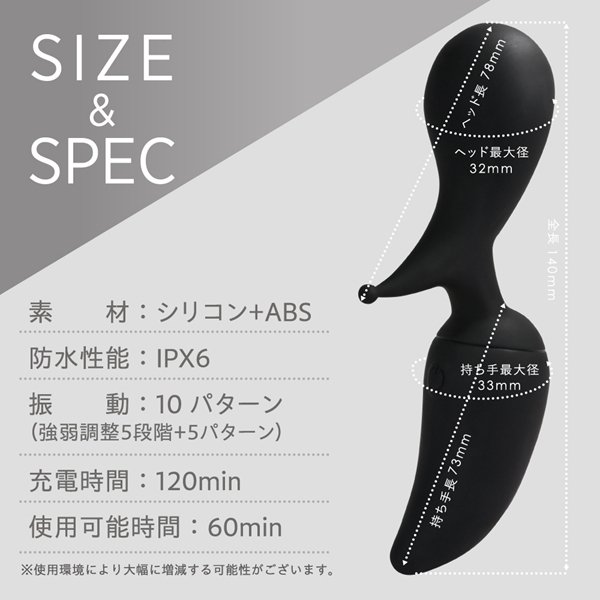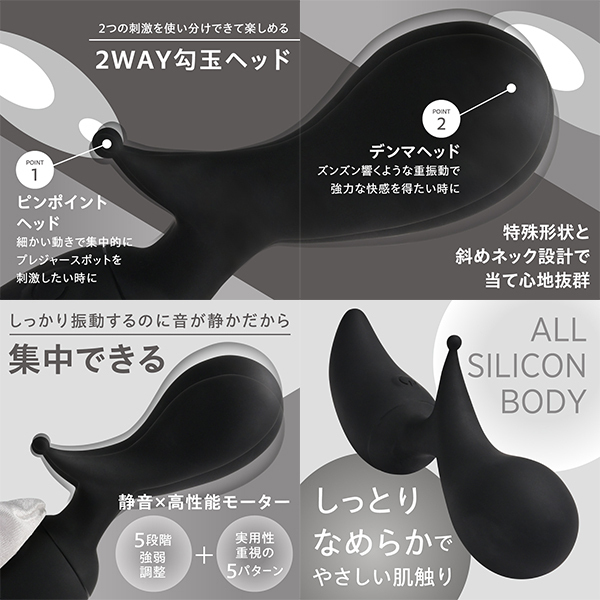 ピンポイント刺激とズンズン響く電マ刺激の両方を楽しめる勾玉型デンマです♪2WAYヘッド設計で、ネック部分に角度をつけることでセルフケアにもぴったり!静音×高速振動モーターを搭載し、5段階の強弱調整が可能です♪さらに実用性の高い5つの振動パターンも合わせ、合計10パターンを自在に楽しめます!オールシリコンボディで、しっとりとやさしい肌ざわりが心地よい使用感を実現♪約120分の充電で、最大60分間の連続使用が可能です!(使用環境により変動します!)IPX6相当の防水性能を備えており、使用後はしっかり洗えて清潔に保てます♪デザイン・性能・使いやすさにこだわった信頼の一台です!