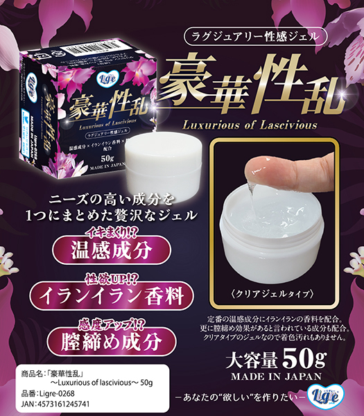 最高にラグジュアリーな性感ジェルの登場!!「豪華性乱」〜Luxurious of lascivious〜 50gです!定番の温感成分に、イランイランの香料配合!さらに膣締め作用成分も配合した超豪華な性感ジェルとなりました!しかも50gの大容量で贅沢に使える!こんなスペシャルで贅沢なジェルは見たことがない!人気の成分がこの一本に総まとめ!これさえ買えば即イキ決定!?ド派手にプレイと行きましょう!