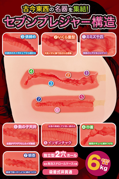 古今東西で「名器」と称される7つの構造【ミミズ千匹、いくら畳型、俵締め、巾着、イソギンチャク、数の子天井、蛸壺】の快感ギミックを贅沢に施しました。